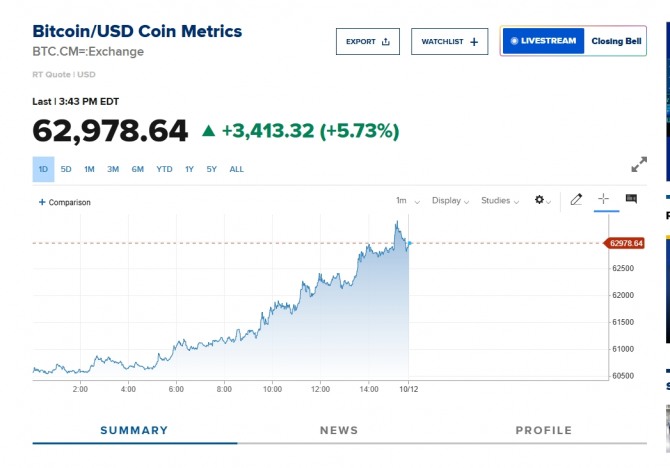 이미지 확대보기12ㅇ리 늉욕증시에 따르면 시장 예상치를 웃도는 미국 소비자물가지수(CPI) 영향으로 6만 달러선 아래까지 떨어졌던 가상화폐 대장주 비트코인이 하루 만에 6만2천 달러선을 회복했다. 비트코인은 상승세를 이어가며 전날 낙폭을 대부분 만회하며 6만3천 달러선에 육박하고 있다.비트코인은 전날 미 노동부가 발표한 9월 CPI가 전문가 예상치를 웃돌면서 지난달 19일 이후 약 20일 만에 6만 달러선이 무너졌다. 한때 5만9천 달러선 아래까지 떨어지기도 했다.