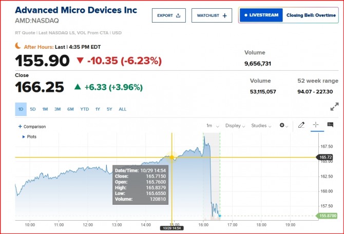 AMD 3분기 매출은 58억 달러이다. 주당순이익은 0.92달러로 나타났다. 4분기 전망이 당초 발표치 보다 낮았다.