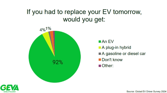 이미지 확대보기11일(이하 현지시각) 테슬라라티에 따르면 전기차 차주들의 이익을 대변하는 글로벌 시민단체 글로벌전기차동맹(GEVA)이 전세계 18개국 전기차 차주 2만3254명을 대상으로 최근 설문조사를 벌인 결과 현재 보유한 전기차를 교체한다면 휘발유차와 디젤차를 비롯한 내연차를 선택할 생각이 응답자는 1%에 불과한 것으로 파악됐다.