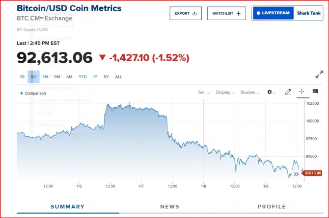 뉴욕증시 일각에선 비트코인이 추가적인 단기 조정을 거칠 수 있다는 분석이 나온다. 존 글로버 레든(Ledn) 최고투자책임자(CIO)는 코인텔레그래프와의 인터뷰에서 “비트코인은 단기적으로 9만달러선에서 지지력 테스트를 할 수 있다”고 전망했다. 레든은 가상자산 담보 대출 서비스를 제공하는 기업이다. 뉴욕증시는 휴장했다. 지미 카터 전 대통령의 장례식이 국장(國葬)으로 치러지는 이날이 '국가 애도의 날'로 지정돼 연방정부 관계 부처가 임시 휴무함에 따라 뉴욕증권거래소와 나스닥거래소도 앞서 임시 휴장 계획을 알린 바 있다.