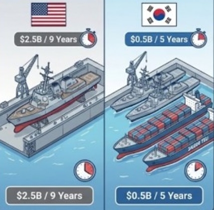 이러한 격차는 군함 건조 분야에서 더욱 벌어진다. 미 해군의 주력인 알리버크급 이지스 구축함(DDG Flight III)은 건조부터 인도까지 평균 9년이 걸리며 척당 비용은 25억 달러(약 3조6700억 원)를 웃돈다. 이에 맞서는 한국의 ‘정조대왕함’(KDX-III 배치-II)은 계약부터 취역까지 5년이면 충분하다. 비용은 약 5억6500만 달러(약 8300억 원)로, 미 구축함의 5분의 1 수준이다. 무장과 성능이 대등함에도 한국 조선소는 절반의 공기로 5척을 만들 비용으로 미국은 겨우 1척을 만드는 현실이다.