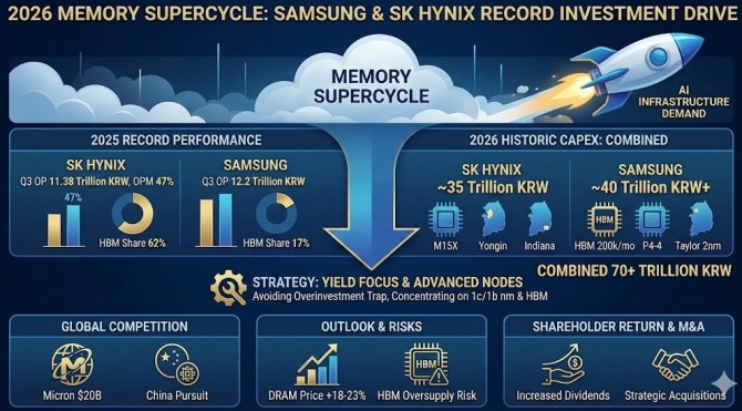 이러한 경험을 바탕으로 양사는 이번 사이클에서 '수율 중심·선단 공정 집중' 전략을 택했다. 과거처럼 웨이퍼 투입량을 무작정 늘리기보다 1c나노·1b나노 등 최첨단 공정 전환에 투자를 집중하고, HBM처럼 수익성이 검증된 고부가가치 제품에 투자를 우선 배정하는 방식이다. SK하이닉스 관계자는 "연간 매출의 35% 수준에서 투자를 조율하며 공급과잉 위험을 관리하고 있다"고 밝혔다.