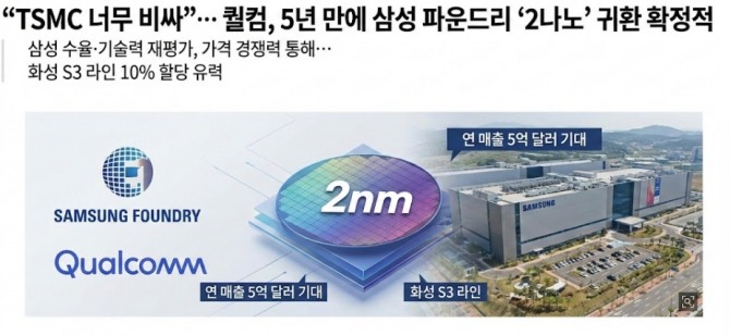 업계에서는 퀄컴이 현재 3나노 공정으로 생산 중인 차세대 주력 칩 ‘스냅드래곤8 엘리트’의 후속 물량부터 삼성전자 2나노 공정으로 전환할 가능성이 크다고 보고 있다. 이는 삼성전자가 5년 만에 퀄컴이라는 최대 고객사를 탈환함과 동시에 최첨단 미세공정 경쟁에서 TSMC를 추격할 발판을 마련했다는 점에서 의미가 크다.