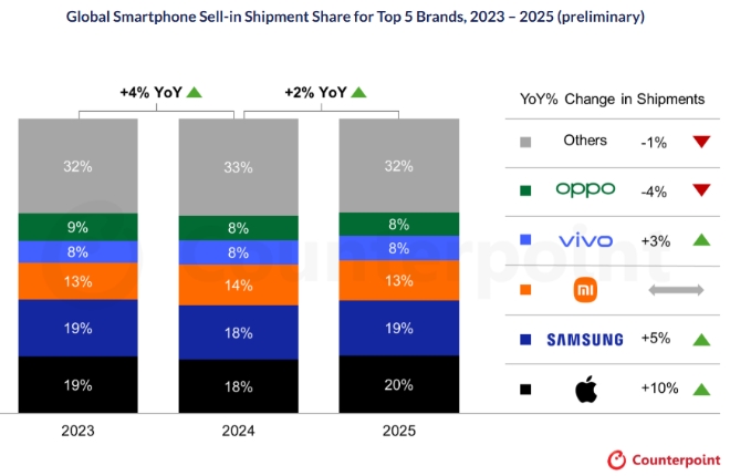 12일(이하 현지시각) 로이터통신에 따르면 시장조사업체 카운터포인트리서치는 이날 발표한 자료에서 2025년 기준 글로벌 스마트폰 출하량이 전년보다 2% 늘었다고 밝혔다. 카운터포인트리서치는 신흥 시장에서의 수요 회복과 경제 여건 개선이 출하량 증가를 이끈 것으로 분석했다.