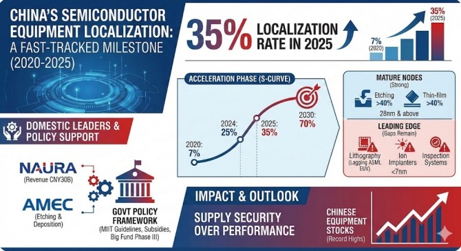 반도체 업계에서는 중국의 장비 국산화 진행 속도가 산업 성장의 'S커브' 이론 중 가장 가파른 상승 구간인 '가속화 단계(10~40%)'의 정점에 다다랐다고 평가한다. 2024년 25%였던 국산화율은 불과 1년 만에 10%포인트 이상 뛰어올랐다.