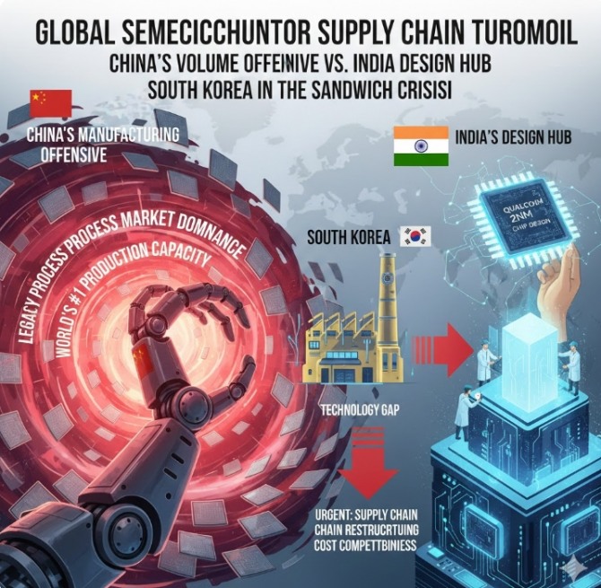 이미지 확대보기니혼게이자이신문(닛케이)과 외신 보도에 따르면 중국은 미국의 규제를 역이용해 28nm(나노미터·10억분의 1m) 이상 성숙 공정 시장의 70%를 장악하며 세계 최대 생산 능력을 확보했다. 동시에 인도는 글로벌 설계 강자 퀄컴과 손잡고 최첨단 2nm 공정 설계 테이프아웃(Tape-out·설계 완료 후 제조 공정 이관)을 완료하며 단순 생산 기지를 넘어 ‘글로벌 설계 허브’로 빠르게 탈바꿈하고 있다.