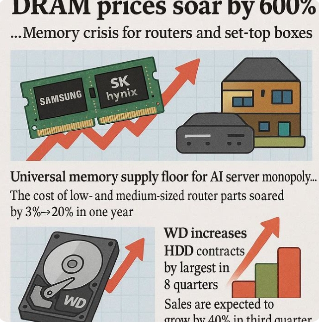 카운터포인트리서치에 따르면 지난 9개월 동안 스마트폰용 메모리 가격은 3배 올랐지만, 라우터·게이트웨이·셋톱박스 등 광대역 제품에 들어가는 '소비자 메모리' 가격은 거의 7배 뛰었다. 특히 공급망이 불안정하고 협상력이 약한 주문자개발생산(ODM) 업체들이 가장 큰 타격을 입었다.