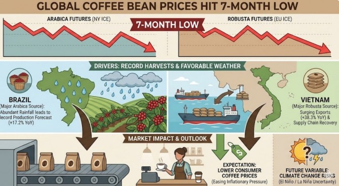 유럽 ICE 선물거래소 3월물 로부스타 커피(RMH26) 가격도 171 달러(약 24만 원)(4.44%) 하락하며 6개월 만에 최저치를 기록했다. 최근 3주 동안 이어진 선물 가격 하락세는 브라질 등 주요 생산국에 내린 넉넉한 비가 이끌었다.