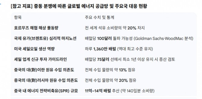 단기 충격 완충책으로는 전략비축유(SPR) 방출이 검토되고 있다. 나티시스의 알리시아 가르시아 에레로 수석 이코노미스트는 "중국의 전략비축유 규모가 11억~14억 배럴에 달하는 것으로 추정되며, 이는 약 140일치 수입 수요를 감당할 수 있는 수준"이라고 설명했다.