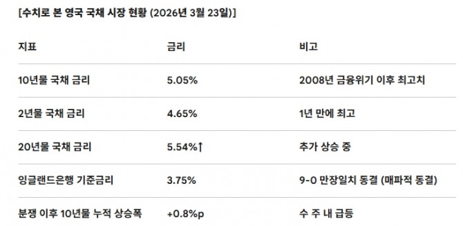 수치만큼이나 충격적인 것은 속도다. 중동 분쟁이 불거진 이후 10년물 금리는 수 주 사이 무려 0.8%포인트 급등했다. 2년물은 같은 기간 97bp(0.97%포인트)나 뛰었다. 영국 국채 시장은 리즈 트러스 전 총리의 무계획적 감세안이 금융시장을 마비시켰던 2022년 9월 '미니 예산(Mini-Budget)' 사태 이후 최악의 한 달을 기록 중이다.