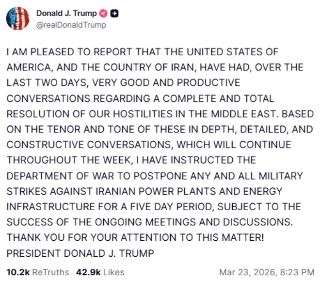 이 거래 직후 트럼프 대통령은 오전 7시4분 자신이 운영하는 소셜미디어 트루스소셜에 이란과의 “생산적인 대화”가 있었다고 밝히는 글을 게시했다. 이후 유가는 급락했고 스탠더드앤드푸어스(S&P)500 선물과 유럽 증시는 상승하는 등 금융시장이 크게 요동쳤다.