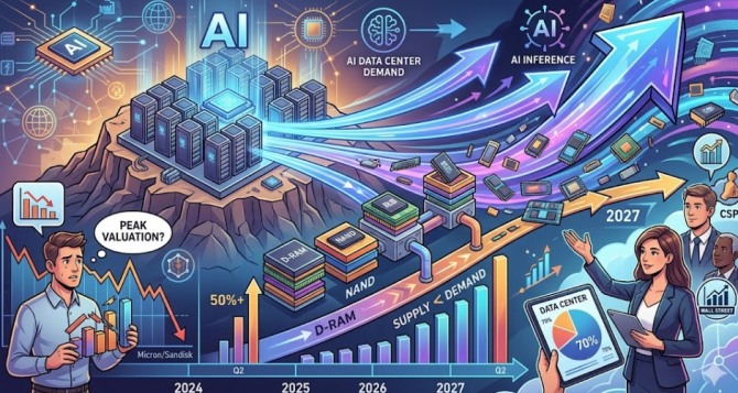 파주리 애널리스트는 D램 시장의 대격변을 예고했다. 그는 "올해 2분기 D램 계약 가격은 50% 이상 급등할 궤도에 올랐다"라며 "이러한 수급 불균형은 최소한 2027년 하반기까지 지속될 것"으로 내다봤다. 특히 올해 전체 D램 시장에서 AI 서버를 포함한 데이터센터가 차지하는 비중은 70%를 상회할 전망이다.