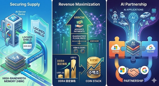 이미지 확대보기디지타임스(Digitimes)는 8일(현지시각) 보도를 통해 삼성전자에 이어 SK하이닉스가 MS, 구글과 수백조 원 규모의 인공지능(AI) 메모리 장기 공급 계약을 추진하고 있다고 전했다. 이번 계약은 2026년부터 3년간 고대역폭메모리(HBM)와 서버용 DDR5를 안정적으로 공급하는 것이 핵심이다. 이번 협상은 반도체 산업의 40년 불문율이었던 '가격 등락의 법칙'이 깨지고 있음을 보여준다.