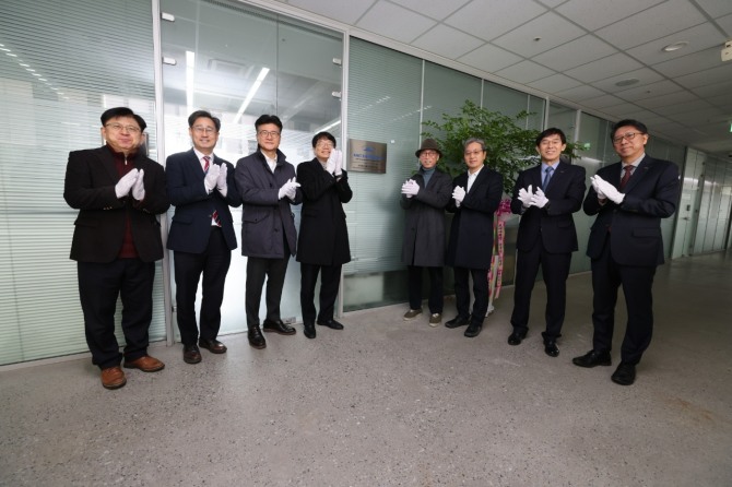 이미지 확대보기김천곤 항공우주공학과 교수의 ‘우주·극한 환경 재료 및 차세대 공정 연구실' 현판식. (왼쪽 다섯 번째부터) 김천곤 책임교수, 이전윤·조한솔 참여교수 및 KAIST 관계자들. 사진=KAIST