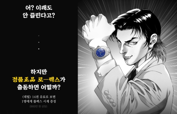 리디 측도 이에 맞춰 "하지판 正品 로-렉스가 출동하면 어떨까?", "추진력을 얻기 위한 세트", "히히히 못 가!" 등 김 작가의 작품 속 유행어들을 문구에 적극 활용했다.