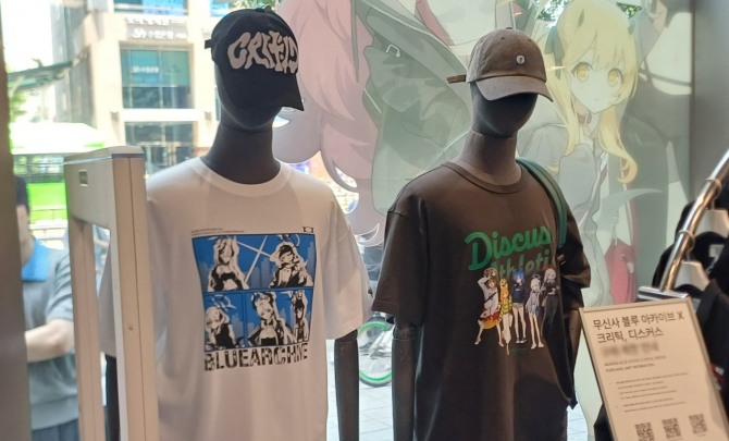 이미지 확대보기홍대거리에 소재한 무신사 스토어에선 의류 브랜드 크리틱·디스커스 애슬레틱이 블루 아카이브와 컬래버해 제작한 티셔츠, 자켓, 모자 등 의류들과 블루 아카이브 테마 아크릴 스탠드, 키링(열쇠고리)가 매장 한 켠에 전시됐다.