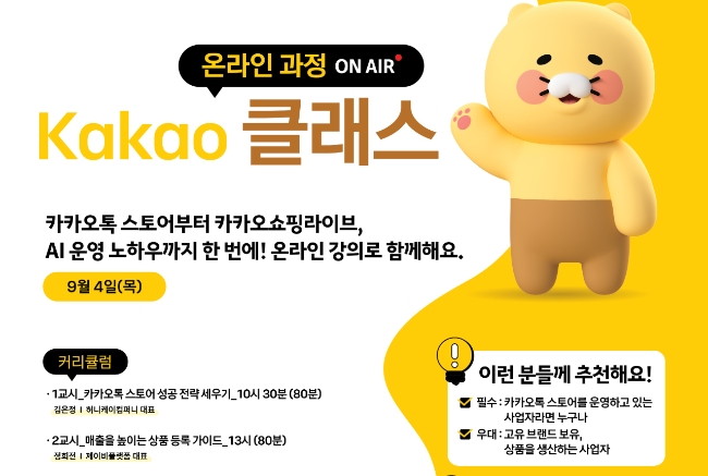 우수 사업자 10팀은 △카카오쇼핑라이브 제작 패키지 △비즈이모티콘 100매 △카카오모먼트 광고 지원금 300만 원을 추가로 받는다. 수강 문의는 카카오톡 채널 'kakao 클래스'에서 1:1 채팅으로 가능하다.