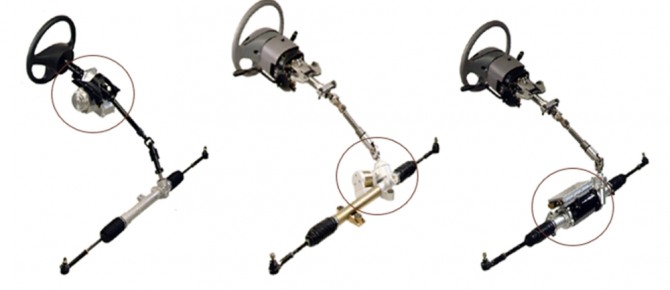 그림 1과 같은 수동식 조향장치는 운전 편의성이 좋지 않아 거의 미미하고, 자동차 운전자의 조향휠(조향핸들) 조작력을 배력하는 장치가 포함되는 동력조향장치의 종류는 아래와 같이 3가지라고 볼 수 있다.