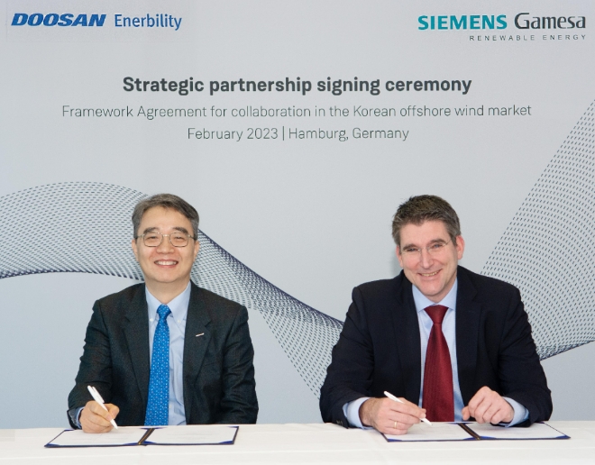 한편, SGRE는 독일 지멘스에너지의 자회사로, 글로벌 해상풍력 시장에서 21GW 공급실적으로 시장 점유율 1위를 기록하고 있다. 현재 6MW급 다이렉트 드라이브(Direct Drive) 부터 14MW급 까지 다양한 해상풍력모델을 보유하고 있다. 2005년부터 풍력사업을 시작한 두산에너빌리티는 국내 해상풍력 최다 공급 실적을 보유하고 있다. 지난해 8MW급 해상풍력터빈 국제인증을 취득했다.