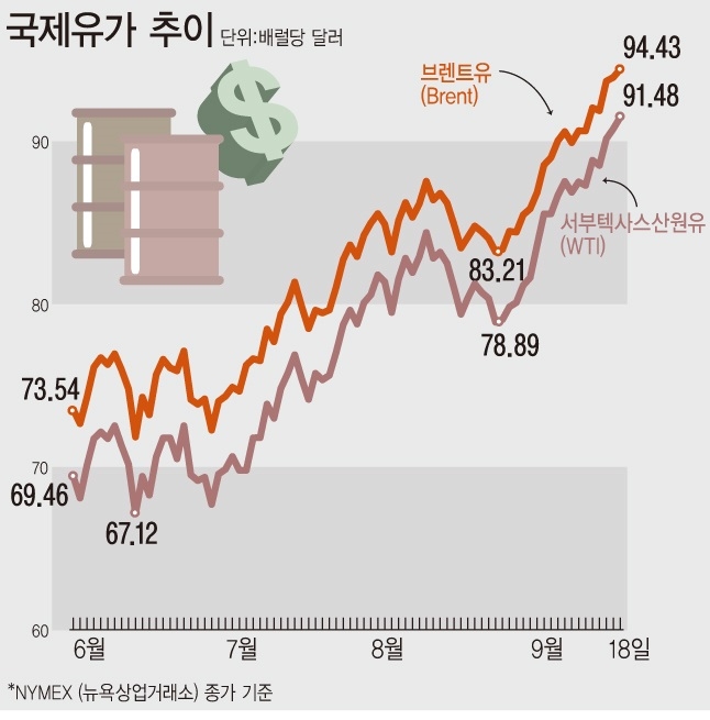 이미지 확대보기18일(이하 현지 시간) 외신 보도에 따르면, 국제유가는 글로벌 공급 차질 우려에 따라 이날 10월 인도분 서부텍사스중질유(WTI) 선물 가격 종가가 91.48달러로 연중 최고치를 경신했다. 이날 런던 ICE선물거래소에서 11월 인도분 브렌트유 선물 가격도 전 거래일 종가 대비 50센트(0.53%) 오른 배럴당 94.43달러로 마감해 올해 최고치를 경신했다.