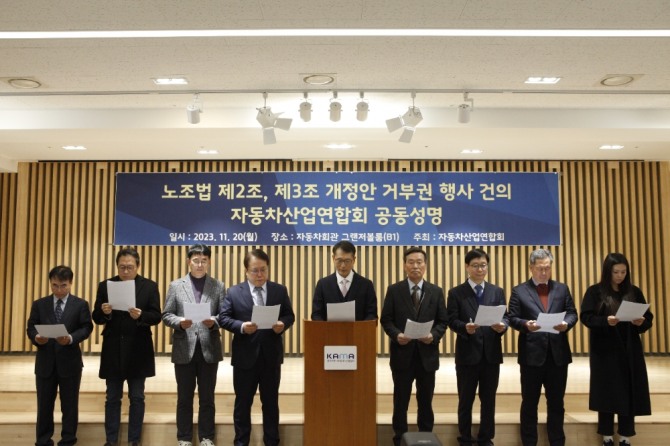 이들은 "미래차 주도권 확보를 위한 국가와 기업들의 경쟁이 날이 갈수록 치열해지고 있어 노사관계 안정, 노동유연성 확대를 통한 생산경쟁력 확보가 절실하다"며 "자동차산업이 '2030년 미래차 3강'으로 도약할 수 있도록 노조법 개정안에 대해 대통령께서 거부권을 행사해 주실 것을 간곡하게 요청한다"고 했다.