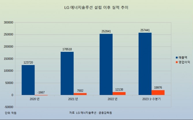 지난 2020년 기준 LG에너지솔루션은 매출 12조3720억원, 영업손실 1667억원을 기록했다. 2021년에는 매출 17조8518억원, 영업이익 7682억원을 달성했다. 같은 해 3분기 영업손실 3727억원을 기록하긴 했다. 하지만 나머지 1·2·4분기 모두 흑자를 기록하며 실적 개선을 이뤄냈다.