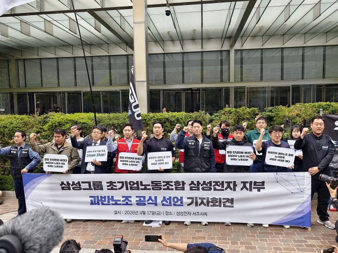 이미지 확대보기삼성전자 초기업노조는 17일 오전 서울 서초구 삼성전자 서초사옥 앞에서 기자회견을 열고 공식적인 과반 노조 및 근로자대표 지위를 확보했다고 밝혔다.