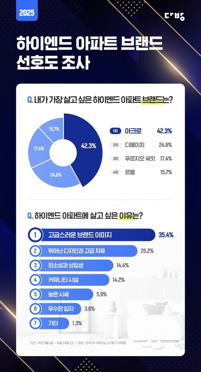 이미지 확대보기다방은 전국 10~50대 남녀 1만7100명을 대상으로 하이엔드 아파트 브랜드 선호도 설문조사를 실시한 결과 DL이앤씨의 아크로가 42.3%로 1위에 올랐다고 8일 밝혔다. 2021년 이후 5년 연속 1위다.