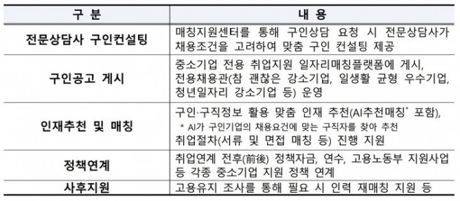 구인기업에는 △전문 상담사의 1대 1 구인 컨설팅 △구인공고 작성·게시 지원 △AI 기반 맞춤 인재 추천 및 매칭 △취업 매칭 전후 중소기업 지원 정책 연계 △고용 유지 조사 기반 사후관리 및 재매칭 등 채용 전 과정을 아우르는 서비스를 제공한다.