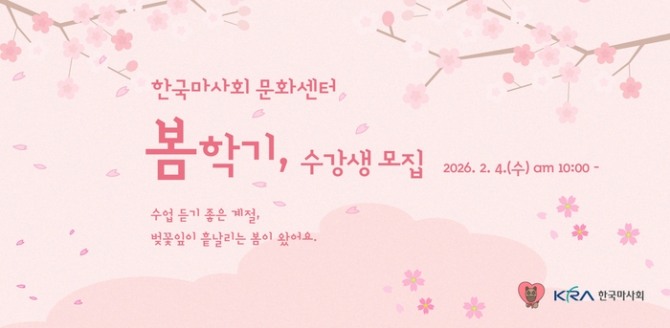 이미지 확대보기한국마사회가 지역 주민의 평생학습과 건전한 여가문화 확산을 위해 2026년 봄학기 문화센터 수강생을 2월 4일까지 모집한다. 봄학기 강좌는 3월 11일 개강이다.