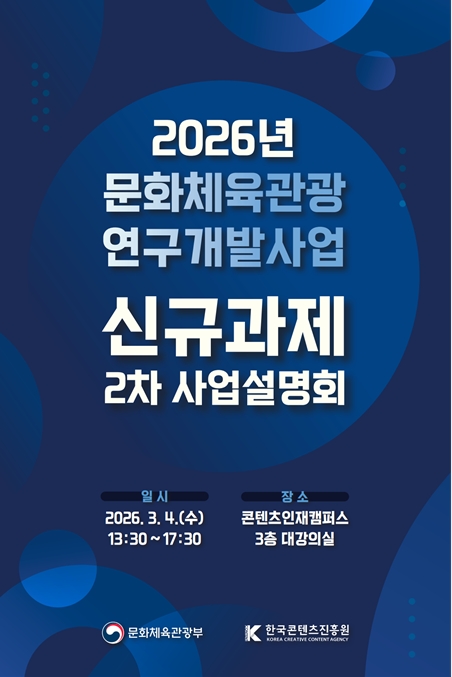 콘진원은 4일 콘텐츠인재캠퍼스에서 ‘2026년 문화체육관광 연구개발사업 2차 통합공고’ 사업설명회를 개최한다.