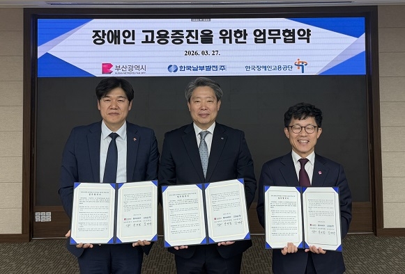 남부발전은 지난 27일 본사 비전룸에서 부산시, 공단과 함께 ‘장애인 인턴 고용 확대와 지속가능한 고용모델 구축을 위한 업무협약(MOU)’을 체결했다.