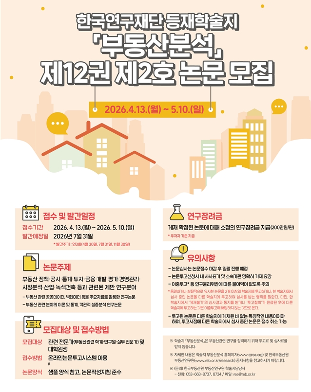 이미지 확대보기한국부동산원이 부동산 분야의 학술 교류 및 연구 활동 장려를 위하여 등재학술지 '부동산분석' 제12권 제2호에 수록할 논문을 다음달 10일까지 모집한다.