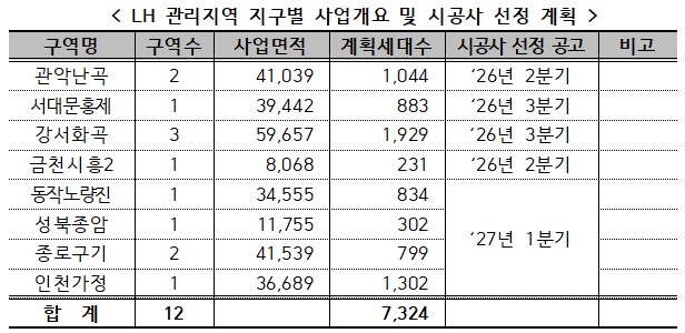 이날 LH가 제시한 로드맵에 따르면 올해 2·3분기 중 △관악난곡(1044가구) △서대문홍제(883가구) △강서화곡(1929가구) △금천시흥2(231가구) 등 4곳에 대한 시공사 선정 공고가 나온다.