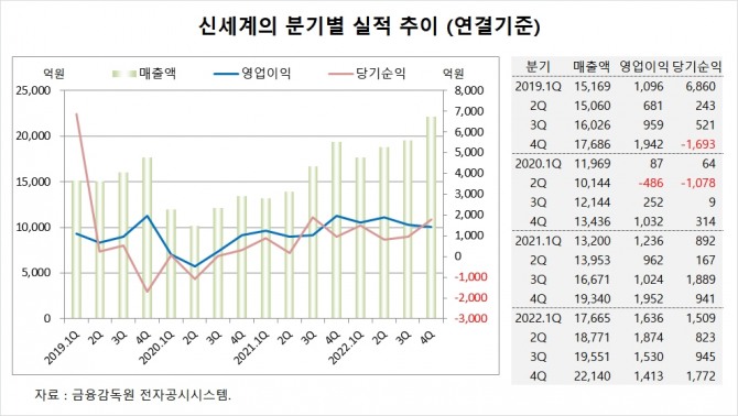 신세계는 지난해 4분기 실적을 잠정 집계한 결과 연결기준 매출액이 2조2140억원, 영업이익이 1413억원, 당기순이익이 1772억원에 이를 것이라고 공시했습니다. 신세계의 4분기 영업이익은 시장 컨센서스인 2031억을 30% 가량 하회했습니다.