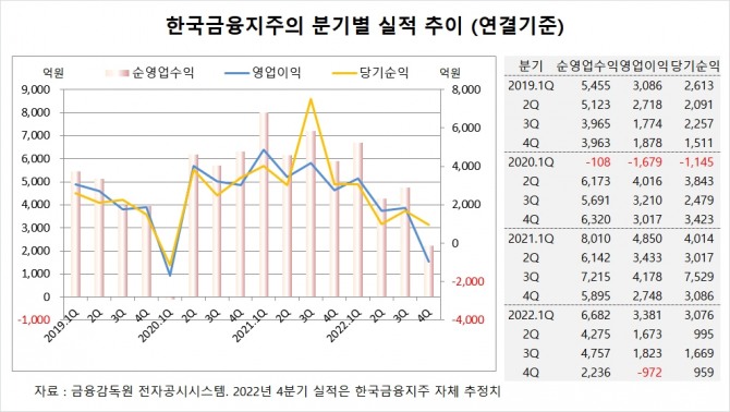 한국금융지주는 지난해 4분기 실적을 잠정 집계한 결과 연결기준 순영업수익이 2236억원, 영업이익이 –972억원, 당기순이익이 959억원에 이를 것이라고 공시했습니다. 한국금융지주의 작년 4분기 영업이익은 시장 컨센서스인 1888억원을 크게 하회했습니다.