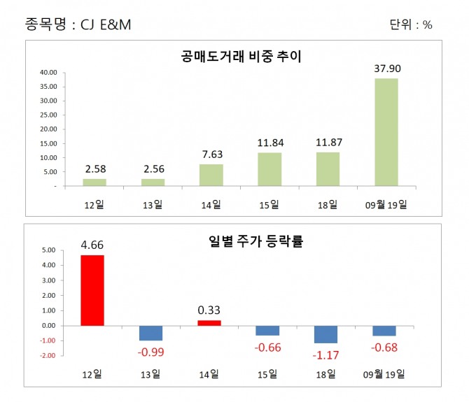 이날 CJ ENM 전체 거래량 3만8148주에서 공매도 거래량은 1만4464주로 공매도 거래비중은 37.9%를 나타내고 있다.