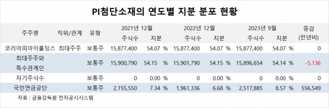 PI첨단소재의 경영권을 매각한 코리아피아이홀딩스의 최대주주는 글랜우드공동투자제삼호사모투자합자회사로 지분 54.35%를 보유하고 있다. 글랜우드코리아제일호사모투자합자회사도 지분 29.35%를 갖고 있다.