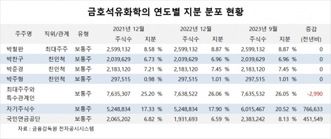 반면 박찬구 명예회장의 지분 6.96%(203만9629주)에 불과하나 박 명예회장의 장남인 박준경 금호석유화학 사장이 지분 7.45%(218만3120주), 박 명예회장의 장녀인 박주형 금호석유화학 부사장이 지분 1.01%(29만7515주)를 갖고 있어 박철완 최대주주의 지분을 넘어서고 있다.