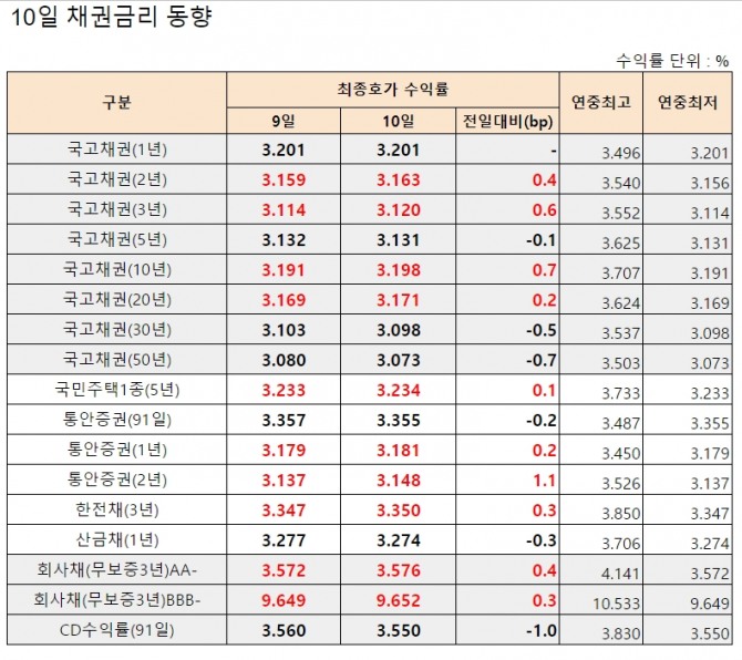10일 국고채 금리는 등락이 엇갈리는 혼조세를 나타냈다.