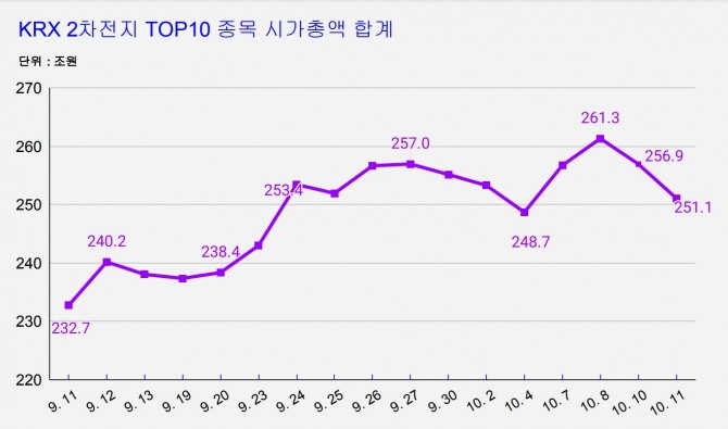 13일 본지가 지난 11일 기준 국내 주요 10개 이차전지 10개 기업의 시가총액 합계를 집계한 결과 251조884억원으로 지난달 11일 232조7232억원) 대비 18조3650억원 증가한 것으로 나타났다.