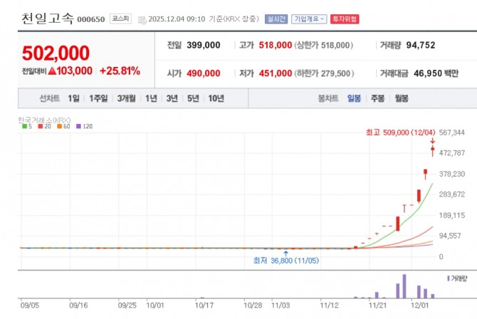 이미지 확대보기이날 한국거래소에 따르면 오전 9시10분 기준 천일고속은 전일 대비 25.81% 오른 50만2000원에 거래되고 있다. 천일고속은 지난 19일부터 전 거래일까지 9거래일 연속 상한가를 기록 한 바 있다. 지난달 18일 3만7000원 대였다.
