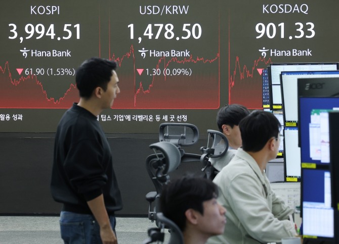이미지 확대보기18일 한국거래소에 따르면, 코스피는 전 거래일 보다 1.53%(61.90포인트) 하락한 3994.51로 마감했다.