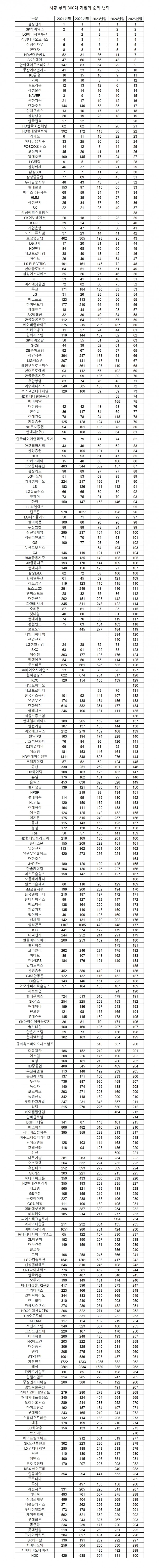 이 기간 신규 상장한 종목 중에서도 빠르게 상위권에 안착한 사례가 있다. 두산로보틱스는 2023년 상장 직후 54위에 올랐고 2025년 103위를 기록했다. 시프트업은 2024년 상장 후 94위에 진입했다가 2025년 190위로 내려갔다.