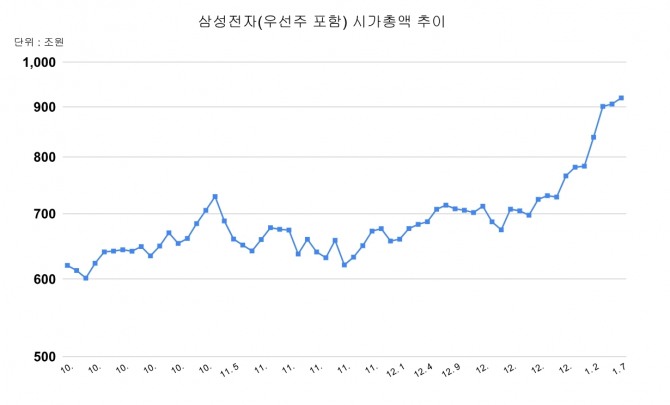 ■ 삼성전자, 단일기업 최초 시총 1000조 시대 임박