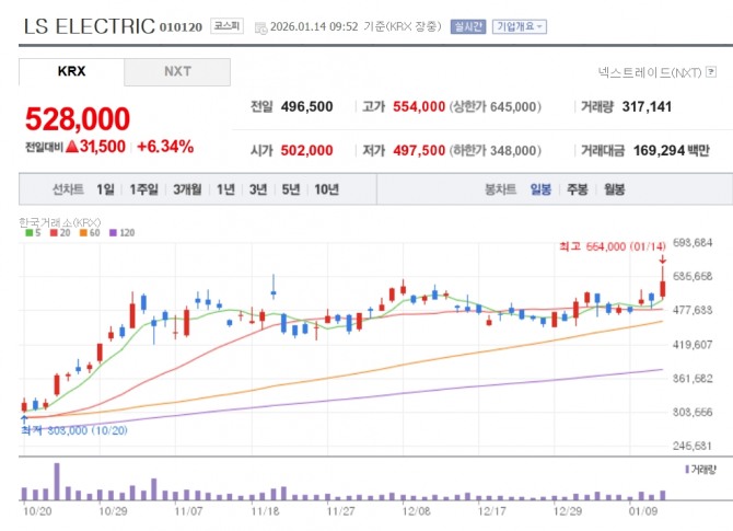 이미지 확대보기14일 한국거래소에 따르면 LS일렉트릭은 이날 오전 9시 52분 기준 전 거래일 대비 6.34% 오른 52만8000원에 거래되고 있다.