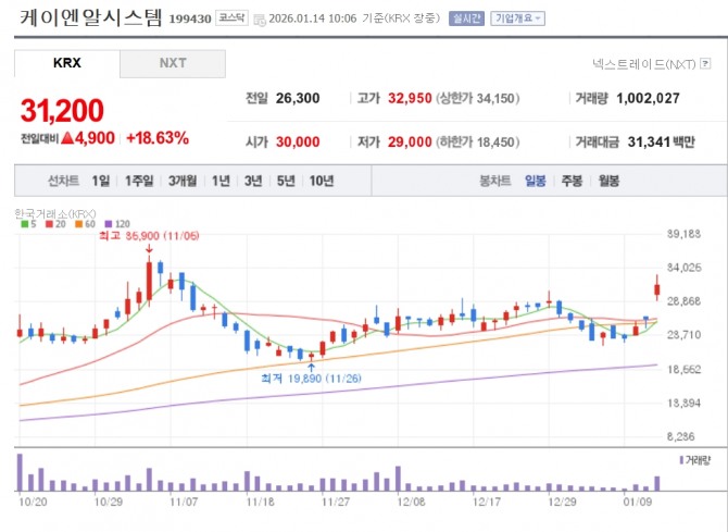 이미지 확대보기14일 한국거래소에 따르면 이날 오전 10시06분 현재 케이엔알시스템은 전거래일 대비 18.63% 오른 3만1200원에 거래 중이다.