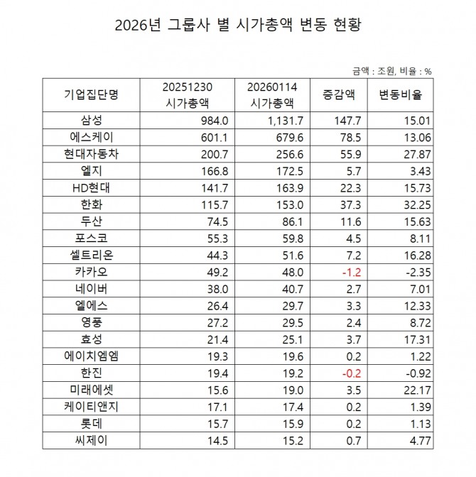 15일 글로벌이코노믹이 집계한 바에 따르면, 지난해 말 기준 1월 14일까지 시가총액 15조원 이상 그룹을 전수 조사한 결과, 삼성 그룹의 시가총액은 984조원에서 1132조원으로 147조원 넘게 증가했다. 증가율은 15.0%로, 절대 증가액 기준 압도적인 1위다.