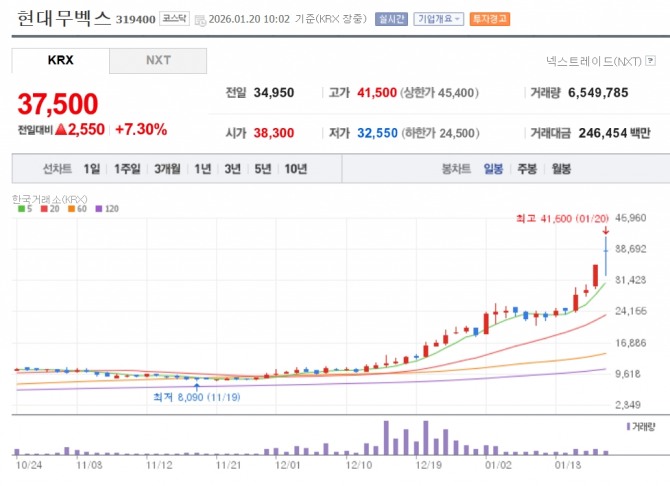 이미지 확대보기20일 한국거래소에 따르면 이날 오전 10시 02분 현재 현대무벡스는 전일 대비 7.30% 급등한 3만7500원에 거래되고 있다. 장중 4만1500원까지 오르며 52주 신고가를 경신했다. 두산로보틱스도 5.94% 상승했다.