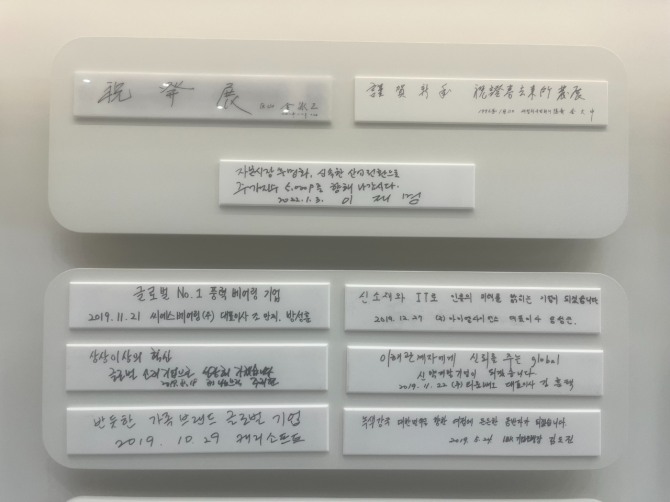 사진은 본 기자가 한국거래소 홍보관에서 직접 촬영한 것으로, 전시 공간에는 역대 주요 인사들의 자필 문구가 남아 있다.
